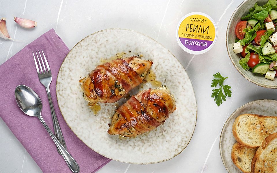 Аккуратно поднимите кожу на каждой куриной грудке, не отделяя её полностью, и ложкой распределите под ней ароматный рбили. Обмотайте каждую грудку тонко нарезанной ветчиной (или прошутто) так, чтобы начинка осталась внутри.