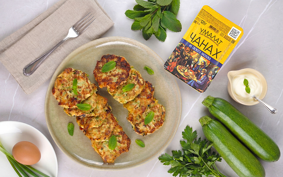 Выпекайте овощные лепёшки на среднем огне до золотистой корочки. Готовые оладьи украсьте мятой и подавайте со сметаной или любимым соусом.