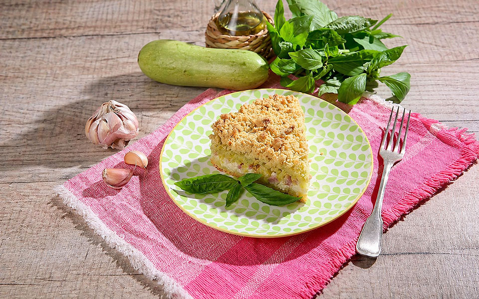 Добавьте сначала нарезанную ветчину, затем тушеные кабачки. Закройте начинку второй половиной теста.