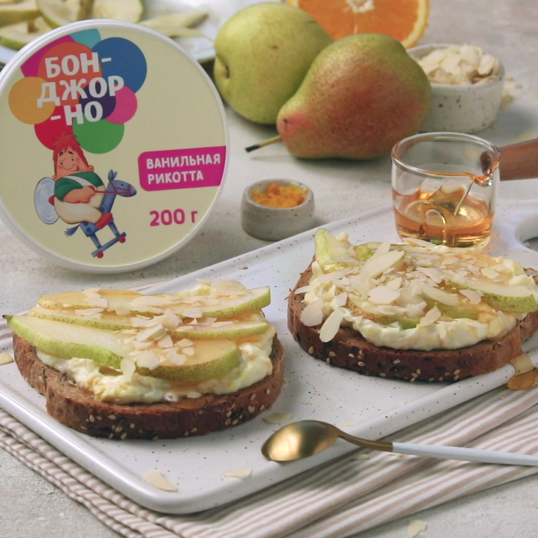 Тосты с ванильной рикоттой, грушей и миндалем
