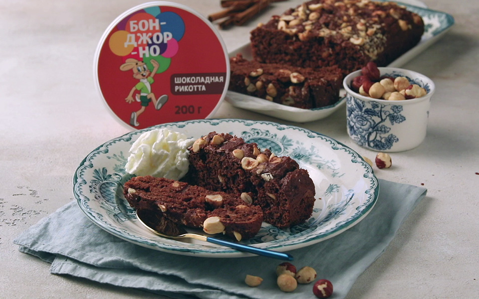 Яйца разделите на желтки и белки. Белки уберите в холодильник. Желтки взбейте миксером с сахаром. Добавьте рикотту и шоколад. Взбейте еще раз. Всыпьте мучную смесь и перемешайте.