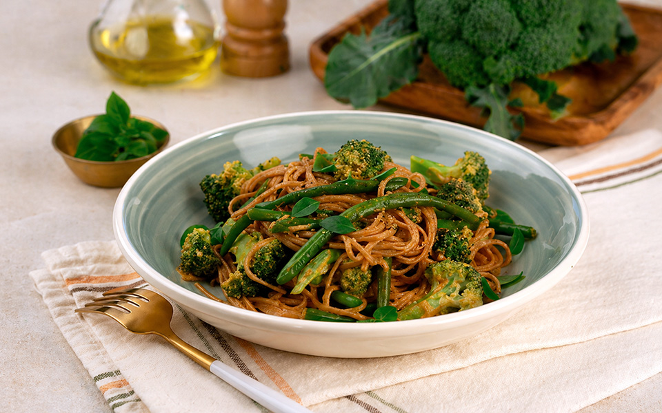 Разогрейте в сковороде растительное масло и обжаривайте брокколи 2–3 минуты. Добавьте стручковой фасоль и готовьте еще 3–4 минуты, помешивая.