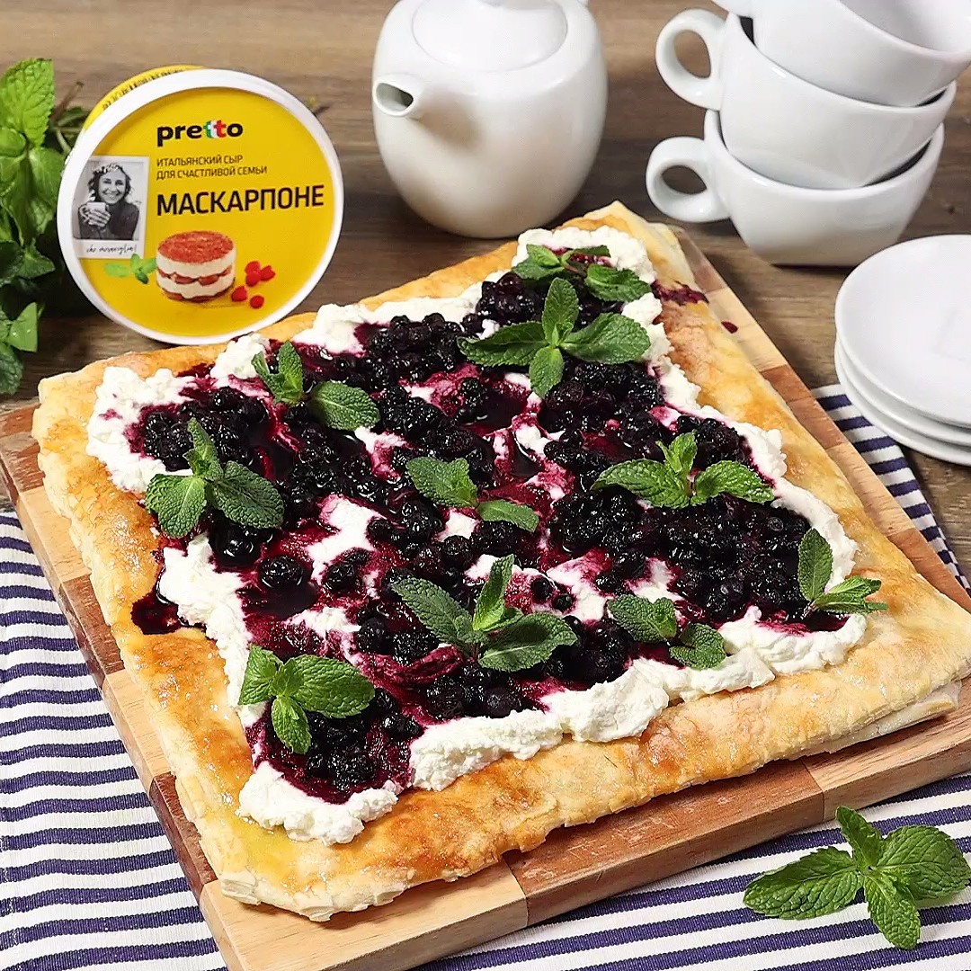 Получившийся крем распределите по остывшей основе. Сверху выложите ягоды в сиропе и разровняйте. Можно украсить листочками мяты.