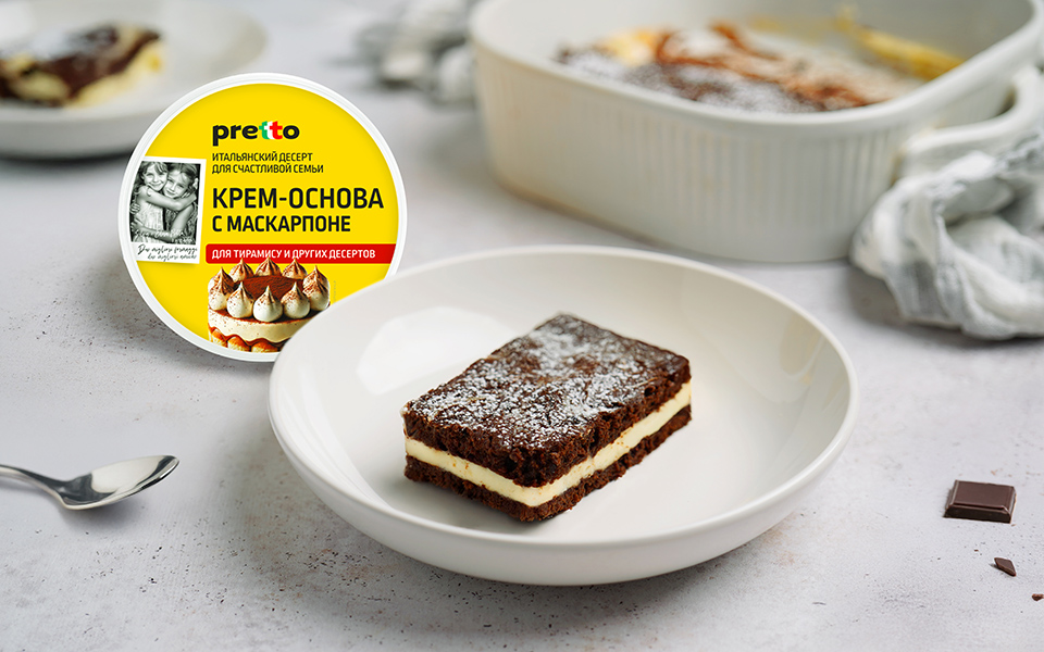 В форму для выпечки выложите сначала половину шоколадного теста, затем аккуратно распределите крем, а сверху выложите вторую часть теста. Шпажкой слегка перемешайте слои.