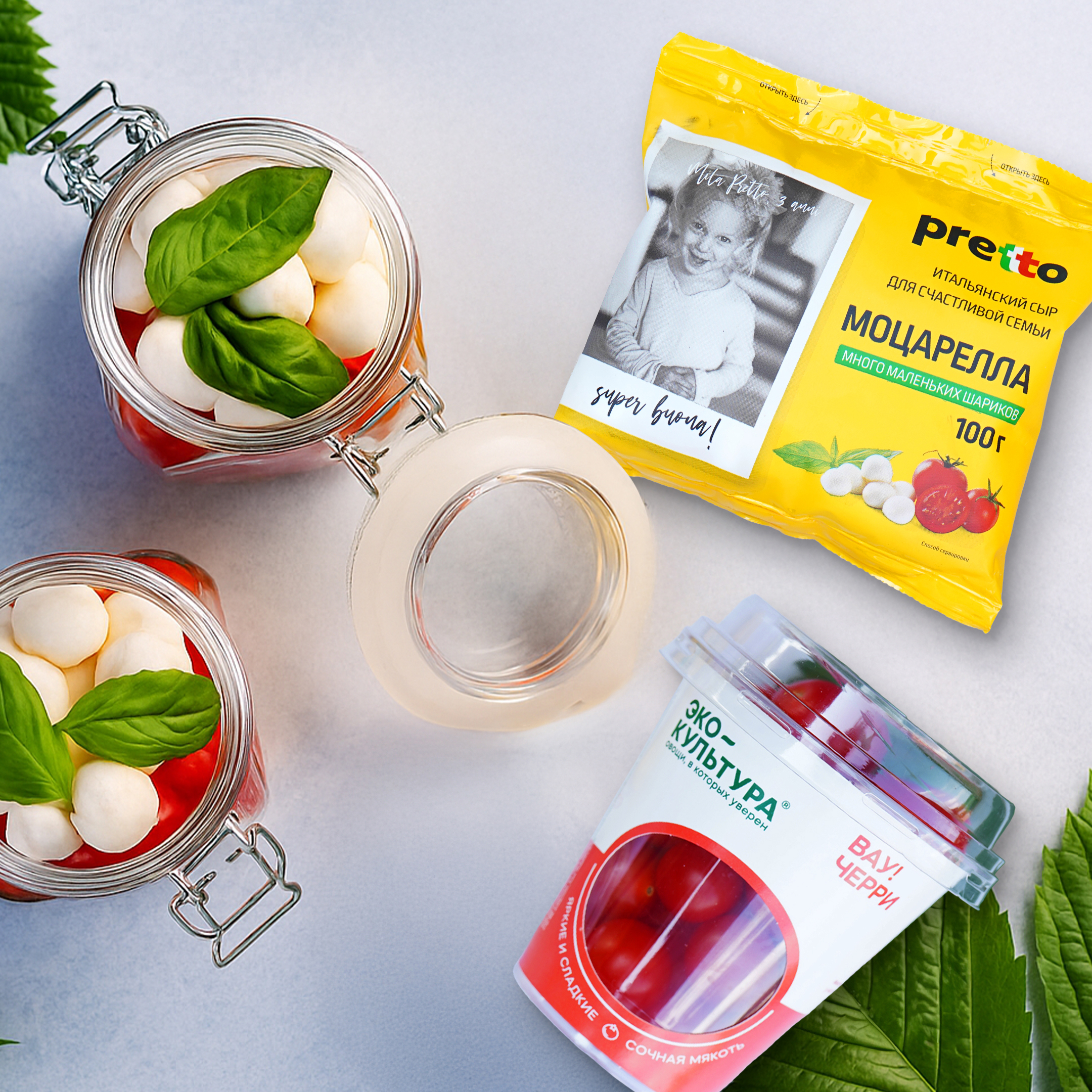 В чистые банки слоями уложите: немного заправки, лук, томаты, моцареллу и базилик. Старайтесь, чтобы слои выглядели красиво через стекло.