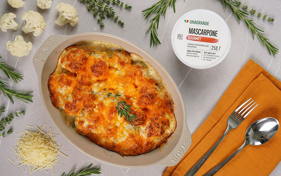 В миске тщательно взбейте маскарпоне, сливки, муку, ¼ части выдержанного тёртого сыра, рубленые травы, пропущенный через пресс зубчик чеснока, соль и перец до однородного кремового соуса.