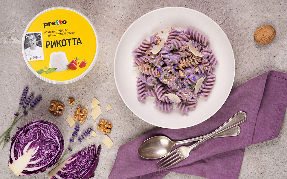 Переложите пасту в сковороду, добавьте фиолетовый крем-соус и немного воды от варки. Прогрейте 1–2 минуты, аккуратно перемешивая, чтобы соус равномерно покрыл пасту. Посыпьте мелко нарезанными грецкими орехами и тёртым пармезаном. Подавайте сразу.
