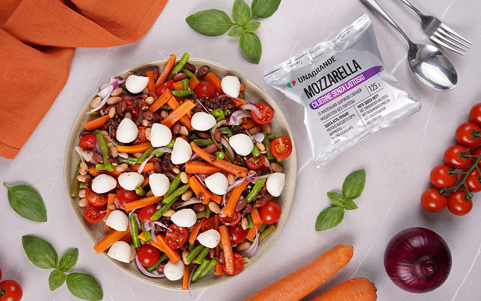 Перед подачей разложите сверху шарики безлактозной моцареллы и при желании слегка поперчите.